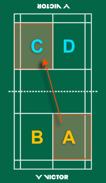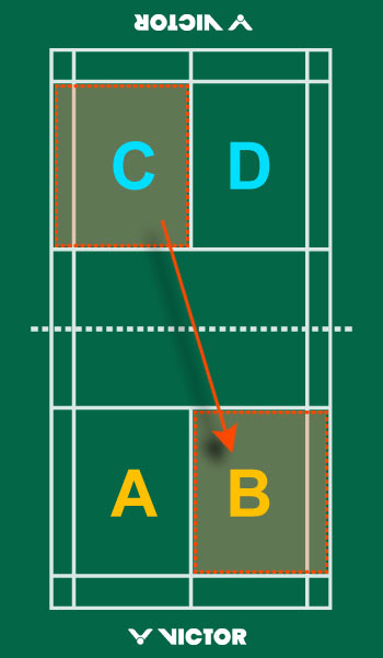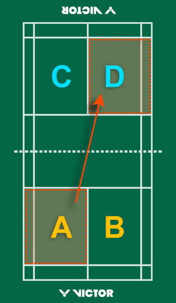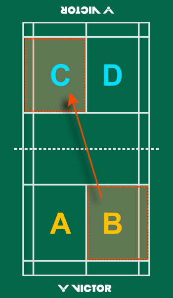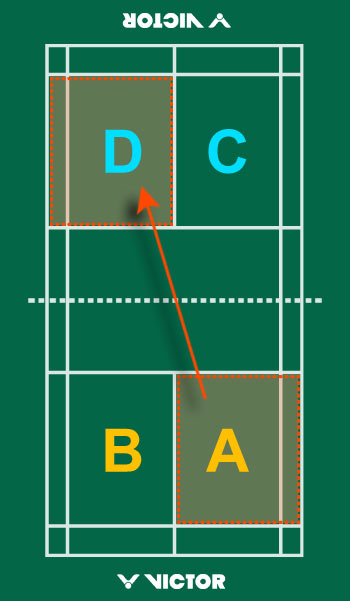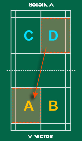 랠리 포인트제 복식경기 서비스 및 리시브 방법 -A와 B,C와D의 복식경기 진행 예, A B조가 토스에서 이겨 선공격.